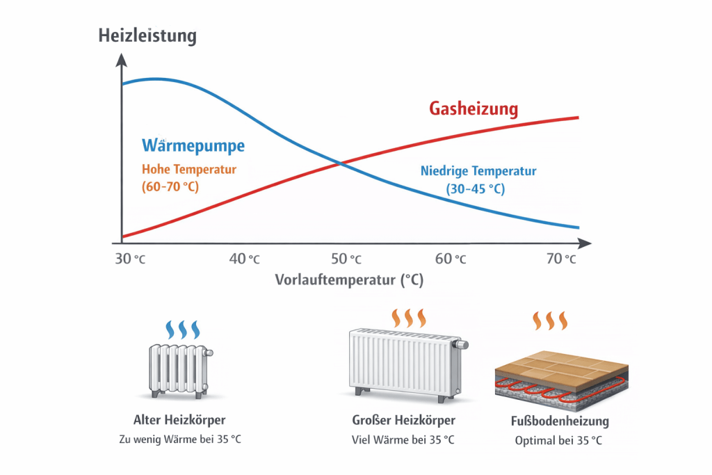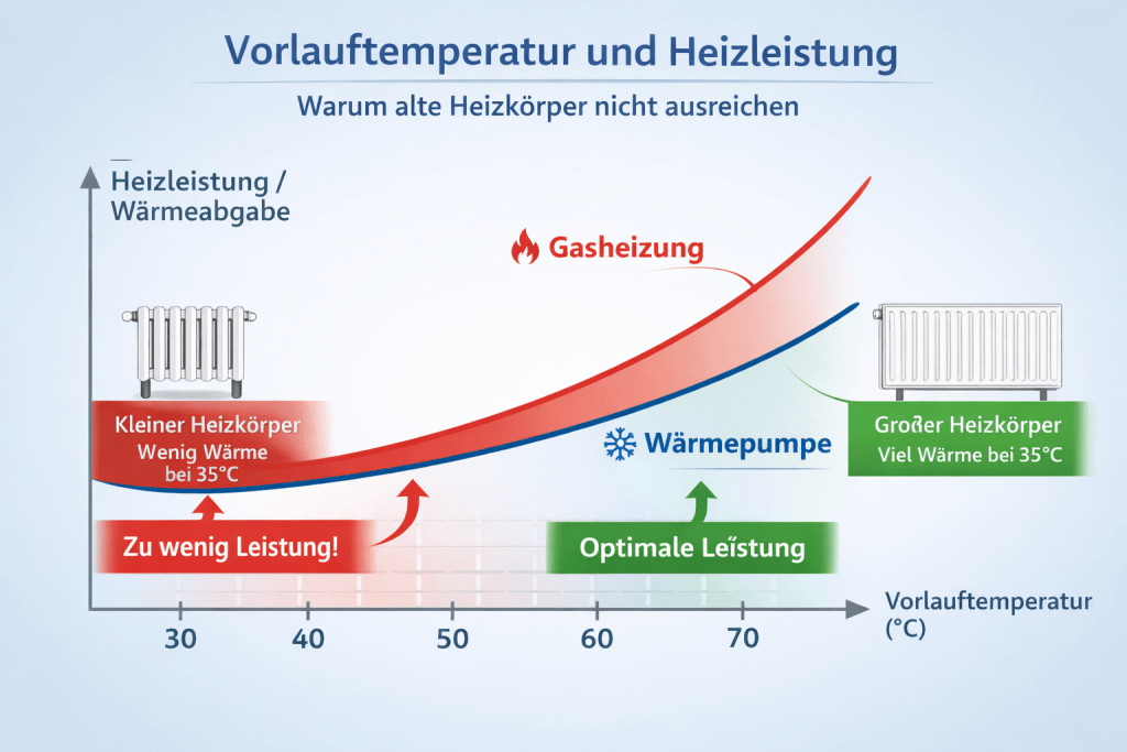 Ein zentraler Punkt ist die Auslegung der Heizkörper. Während klassische Öl- und Gasheizungen mit hohen Vorlauftemperaturen arbeiten, sind Wärmepumpen auf deutlich niedrigere Temperaturen optimiert. Genau hier entsteht häufig ein Missverhältnis. Viele bestehende Heizkörper wurden ursprünglich dafür ausgelegt, bei sehr heißem Wasser ausreichend Wärme abzugeben. Wird die Temperatur durch den Einsatz einer Wärmepumpe gesenkt, reicht die Heizleistung dieser alten Modelle oft nicht mehr aus.